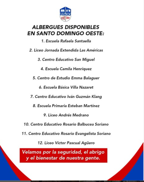 En atención a las disposiciones del Comité Municipal de Prevención, Mitigación y Respuesta (PMR) y en coordinación con los organismos de socorro, la Alcaldía de Santo Domingo Oeste informa a la ciudadanía sobre la habilitación de albergues temporales para garantizar la protección de las familias ante posibles eventualidades climáticas y de emergencia.