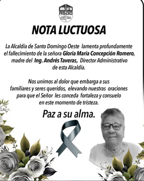 La Alcaldía de Santo Domingo Oeste lamenta profundamente el fallecimiento de la señora Gloria María Concepción Romero, madre del Ing. Andrés Taveras, Director Administrativo de esta alcaldía.