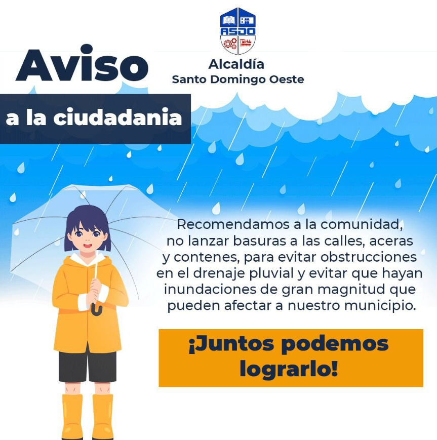 Recomendamos a la comunidad, no lanzar basuras a las calles, aceras y contenes, para evitar obstrucciones en el drenaje pluvial y evitar que hayan inundaciones de gran magnitud que pueden afectar a nuestro municipio.
